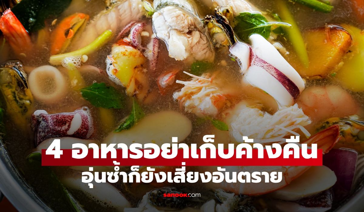 บทความนี้จาก Sanook นำเสนอข้อมูลเกี่ยวกับอาหาร 4 ชนิดที่ผู้เชี่ยวชาญแนะนำว่าไม่ควรเก็บไว้ค้างคืน ซึ่งแม้จะอุ่นใหม่ก็ยังคงมีความเสี่ยงได้