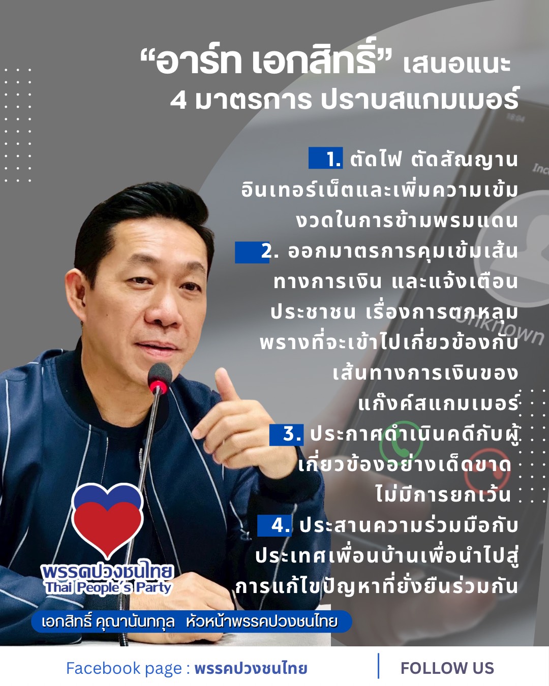 นายเอกสิทธิ์ ศรีสว่าง หรือ “อาร์ท” ได้แสดงความกังวลต่อสถานการณ์ภัยออนไลน์ที่ทวีความรุนแรงขึ้นอย่างต่อเนื่อง โดยเฉพาะปัญหาแก๊งคอลเซ็นเตอร์และสแกมเมอร์ที่สร้างความเสียหายมหาศาลให้กับประชาชน พร้อมเสนอแนวทางแก้ไขปัญหาอย่างเป็นรูปธรรมผ่าน 4 ขั้นตอนหลัก เพื่อปกป้องคนไทยและปราบปรามขบวนการเหล่านี้อย่างจริงจัง